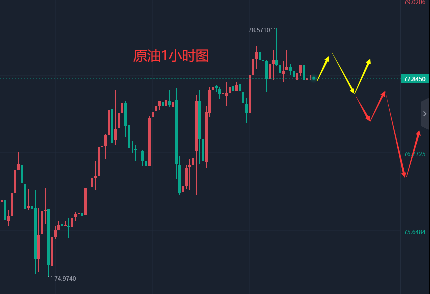 操作上,日内保守选择还是暂作观望为宜,因为目前美油一直处于日线级别均线带内震荡运行,短线行情有很大的选择性。而激进则可继续尝试短线区间操作,但是难度和风险都比较大,即上方关注78.3-6短压,下方关注77.2-0短支撑,以及76.5支撑,在上述区间内进行短线低多高空,务必仅以短线极轻仓尝试。