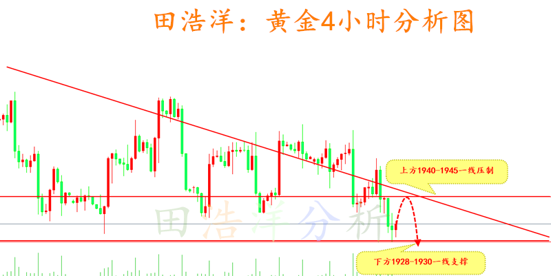 从4小时分析图来看,目前黄金下探1928一线后也将形成弱势修正,下方支撑1928一线也是重点支撑对象,如继续下破此位置的话,则美盘之前反抽做空即可,操作相对简单,小幅反抽横盘于1940-45附近的话,则美盘等待反抽后继续做空,这也是一方面,目前日线连阴形成压制,短期均线也有效果,各个方面都已经准备就绪,只等空头临门一脚形成突破后继续下挫,操作上依旧保持反抽主空节奏,具体操作策略我会在盘中提示,及时关注。