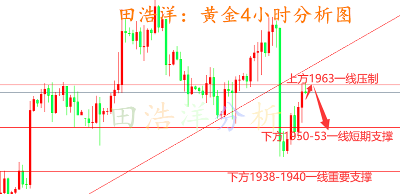 从4小时分析图来看,上方压力关注小时线开跌口1963关口,下方关注1948-1950一线短期支撑,守住1963一线继续主空,日线级别未站上此位置之前任何反抽均是做空机会,保持顺势参与主基调,具体操作策略我会在盘中提示,及时关注。