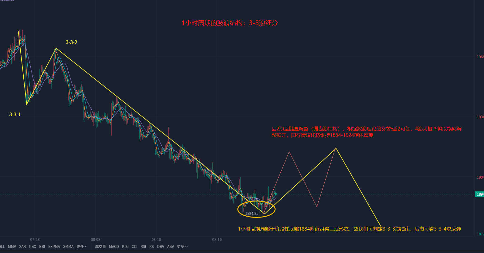 如之前分析可知:自1987起的行情可视为3浪下行,且3浪可细分呈5浪结构。为方便分析,我们可将3浪进行细分,在这里我们为了简化波浪和方便分析,暂先只对3-3浪进行细分和分析,由现有行情推演可知,我们可将3-3浪再次细分呈5浪结构,如图中黄色线所示。因行情于阶段性底部1884附近录得三底形态,底部形态确认,故我们可判定3-3-3浪于1884附近结束,行情正处于3-3-4浪反弹之中,根据波浪推演可知:3-3-4浪的理论顶部位于1918附近,于1918-1924阻力区间契合!因2浪呈陡直调整,根据波浪理论推演可知:4浪大概率将以横线调整展开,即行情短线仍将震荡于1924-1884区间。目前行情最高企及1924一线,4浪是否完成仍有待更多信号!