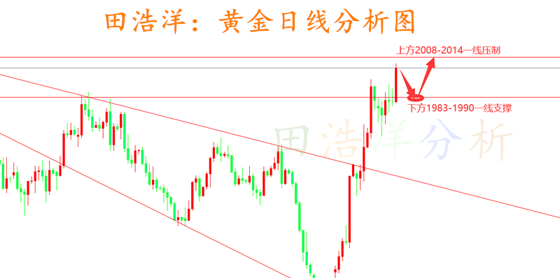 从日线分析来看,今日上方压力关注2008-2014一线,下方支撑关注1983-1990一线,受局势和技术面影响,操作上以回踩做多为主,高位勿追多,具体操作策略我会在盘中提示,及时关注。