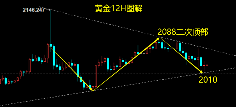 黄金,大趋势接连续分析所述,本轮价格自抛售1973二次上涨2088确认顶部进入中期下行周期,非农利空冲高2064回落洗盘;文中强调K线组合为空头形态,后市仍主震荡下行,初始目标1973-2088连线61.8%节点2017及2010平行攻防,若失守则回看1973低位;