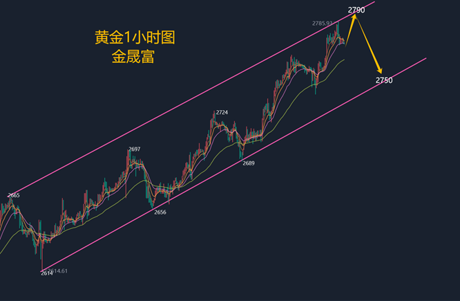 小时线支撑在2770,也是周一的多空分水。行情如果继续走多并且强势的话,可能2770附近先涨。如果跌破2770,行情就偏震荡,会去顶底转换2752一线,也不排除再去周五低点附近。行情只有有效下破昨天低点,才能有一波像样的回调。上方压力2785附近,如果受阻回落,可能头肩顶形成,目标差不多昨天低点2752附近。所以周一如果正常开盘,我们再试按照高位震荡操作。综合来看,下周一黄金短线操作思路上金晟富建议反弹做空为主,回调做多为辅,上方短期重点关注2788-2790一线阻力,下方短期重点关注2748-2750一线支撑,各位朋友一定要跟上节奏。要控制好仓位及止损问题、严格设止损,切勿抗单操作。具体点位以盘中实时为主,欢迎前来体验,交流实时行情,进群关注实时单。