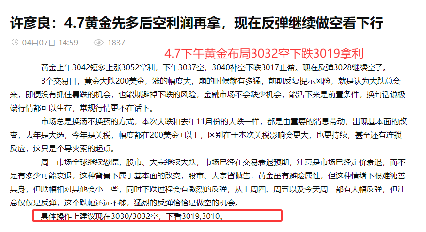 黄金上午3042短多上涨3052拿利,午后在3032空又是下跌3019继续赚,下午反弹3037空,3040补空下跌3017止盈。黄金晚间3044空下跌3025止盈,反弹3033再次开空又是如期下跌3010继续拿利。