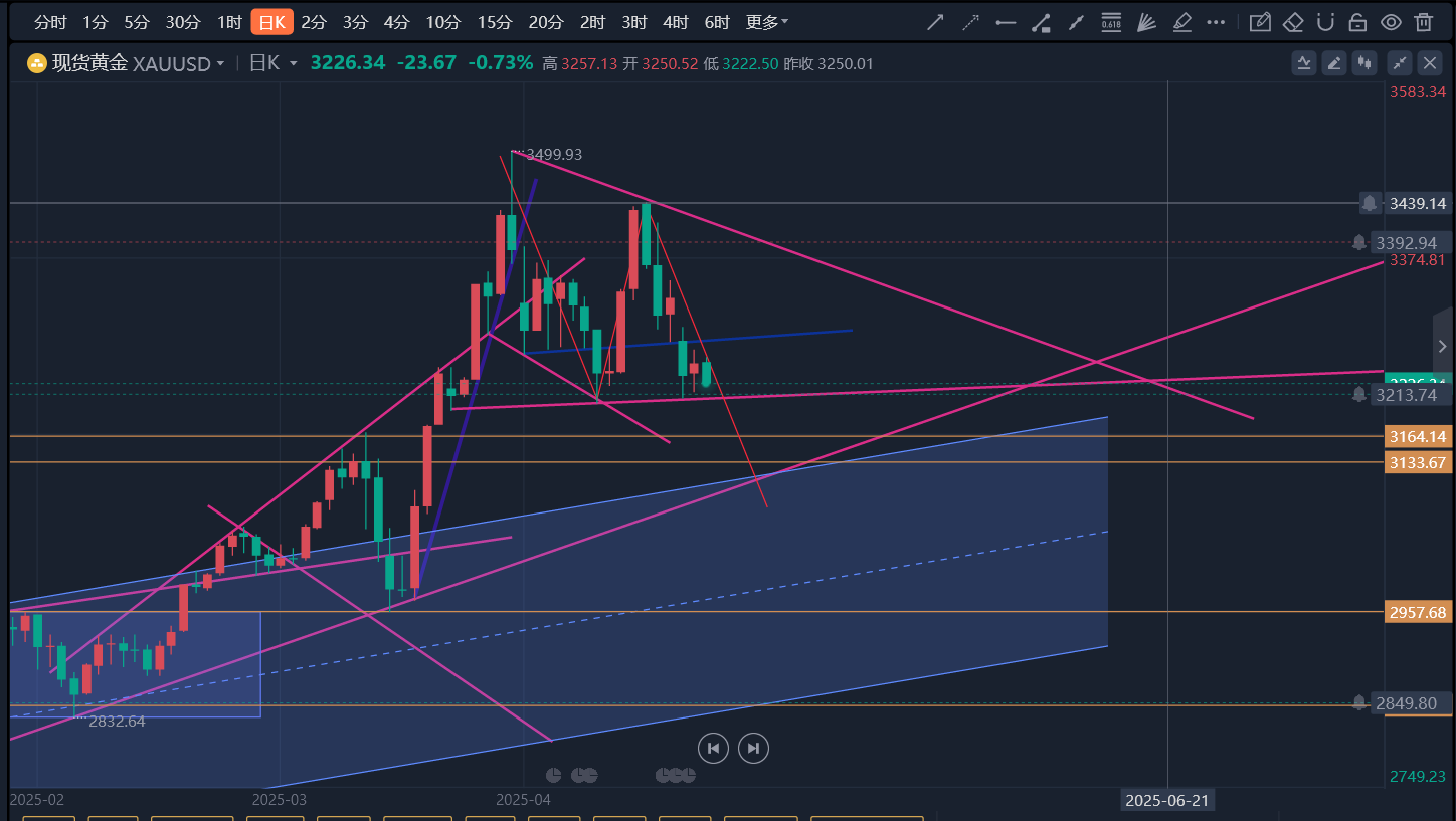 黄金,终于跌破3200美元大关,空头迎来真正控盘周期。3200美元是什么位置?是3500阶段见顶后二次大涨位置,3200守住那么走W底,向上回补周一跳空缺口甚至冲击3400一带再跌;向下击穿,那么M头形成,下方目标剑指3140及3000大关及2957区域,也是大C浪下跌的目标位,是上一轮大涨500余美元多头启动位置,这里是未来多空终极较量的位置。黄金上一轮大涨,和当前下跌,主要是基本面驱动。