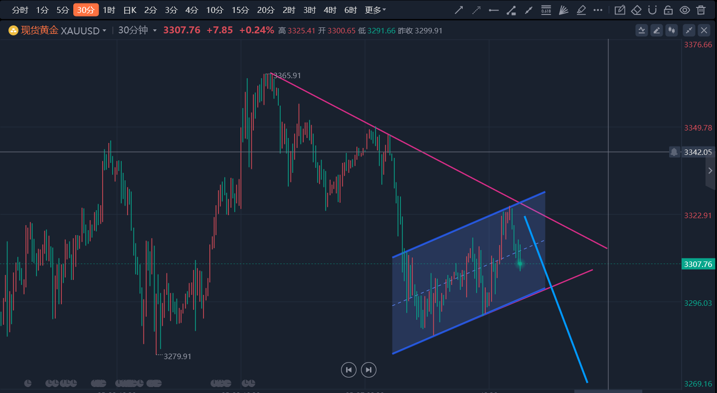 晚间预期:美盘前回调,美盘后可能二次拉升测试上轨阻力(3323附近),后半夜关注能否再次承压回落。