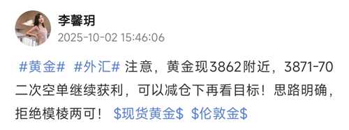 10.1 周三,公开策略提示黄金强势3854直接做多,完美预测回踩低点,大涨至3895一线!