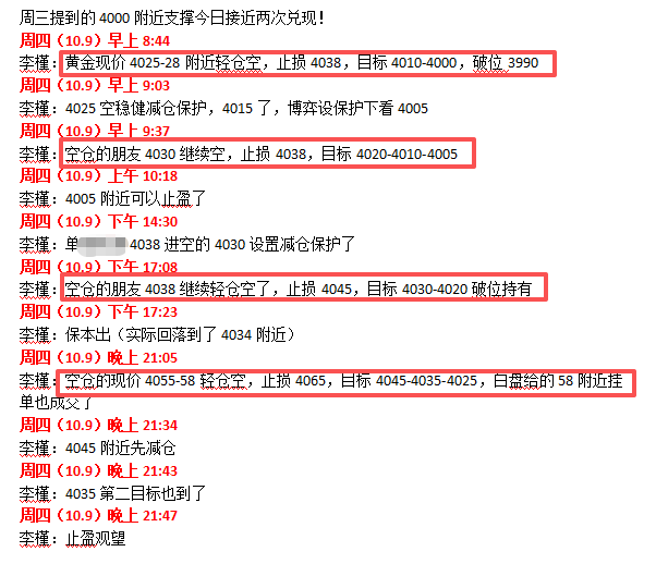 今日实战又开始封神模式!早盘实战4025空、4030空都收获不错。周三公开提示的4000支撑,今日也有两次接近兑现,大家都有见证。我们早上的思路有提到4038压制,欧盘有朋友私信我们也明确给出这里干空思路。美盘实战4055空,提前挂4058附近的空也有成交,当然我们早盘公开也有给到接近昨日高点4059附近空的思路,行情弱势提前下行,这波跌势有点猛,最低来到了4020附近,我们也及时减仓了。