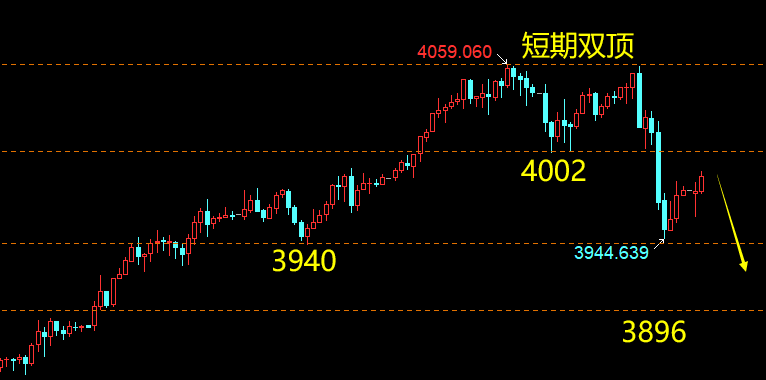 黄金,周初价格受避险情绪提振连续突破3900-4000关口,周三冲高3959回落,周四再次冲高承压,并在4059构筑短期双顶形态,隔夜抛售至3945,收盘3976;日图录得大阴,K线组合呈滞涨下行排列,日内延续看跌,目标下调至3900-3800区间,中期是否反转需等日图连阴确认;