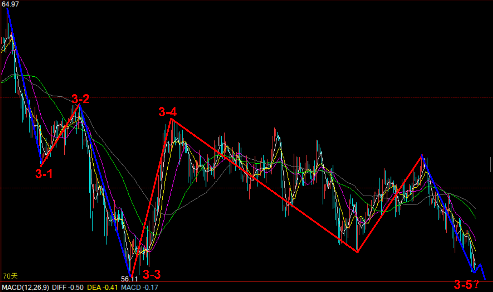 在我们前期的数浪中3-1浪从64.97美元跌到59.80美元,跌幅为5.17美元,3-2浪从59.80美元反弹到61.74美元,反弹幅度为1.94美元,3-3浪从61.74美元跌到56.11美元,跌幅为5.63美元,3-4浪从56.11美元反弹到61.25美元,反弹幅度为5.14美元,目前3-5浪从61.25美元跌到目前的低点56.23美元,跌幅为5.02美元,目前3-5浪的跌幅已经非常接近3-1浪了,但是从波浪理论的常规走势来说3-5浪大多数要跌破3-4浪的起点的,也就是说3-5浪还有1.12美元的下跌空间才能跌破3-4浪的起点,那么这样3-5浪的跌幅就超过3-3浪成为最长的一浪了,从目前行情长期处于主跌3浪的走势来看,当主跌3浪的尾浪3-5浪跌破55美元之后就基本上走完了,后期主跌5浪继续发力就会跌破50美元甚至去试探45美元之后才能算走完一个完整的波浪,最后才能主升浪了,所以我们今日继续用小的止损去做稍大利润空间的空单,如下。