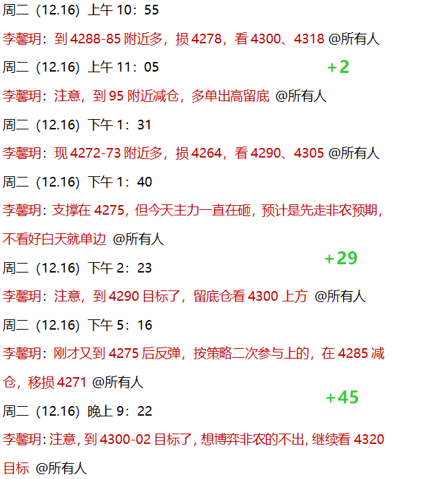 12.16 周二,欧盘前公开策略4275继续做多,晚间已大涨至4333,这波50-60点大幅利润,关注做上的又是大赚!实盘中,早间先安排了4288-85多单,在4295减仓后整体小赚!午后二次下探,又安排了4272-73多单,坚定持有,最终4300-05止盈离场!欧盘按策略的4275二次多单,也在非农数据后止盈4220目标!今日多单三连胜,斩获76点,公开做多又是全网见证!