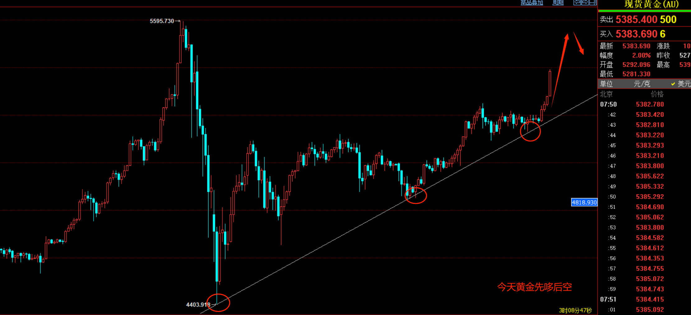 从2月18号早盘4864一路低多到今天,周末借助美伊冲突消息的避险影响,早盘黄金高开高走,目前黄金报价5384,短期黄金多头延续,技术角度来看,黄金自突破5110后,底部成立,上周周五突破5220,再次打开上方多头空间,黄金继续看到前期高位5530.5590等位置,今天亚欧盘注意黄金冲高后回落的风险。