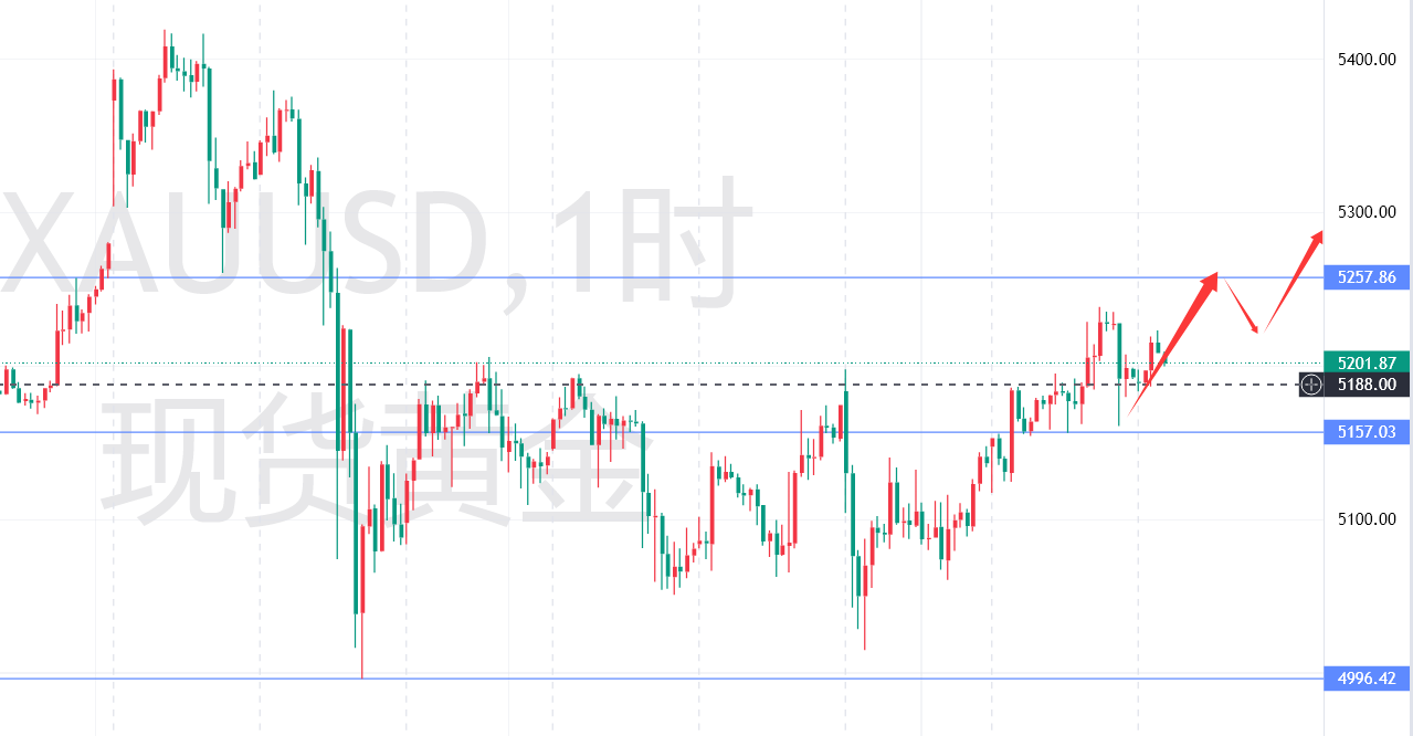 黄金技术面分析:黄金价格成功突破分析的双顶压制位5206,最高触及5238.54,完美兑现前期回调做多的思路,从上周低点4996开启的反弹走势进一步延续,当前多头趋势表现强劲,小时级盘面整体偏多格局未发生改变。从价格走势来看,前期规划的反弹618目标位5257.86成为当下最核心的上行目标,该位置是上周5419至4996下跌波段的关键反弹阻力位,大概率会形成阶段性的价格压制,需重点关注此位置的触及及突破情况。