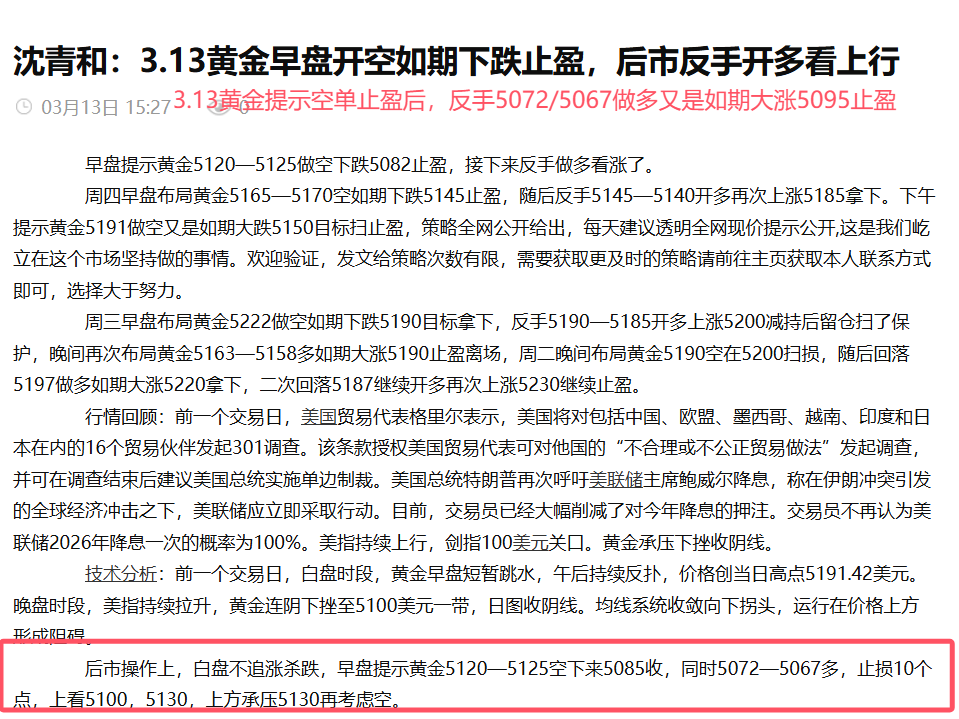 周四早盘布局黄金5165—5170空如期下跌5145止盈,随后反手5145—5140开多再次上涨5185拿下。下午提示黄金5191做空又是如期大跌5150目标扫止盈,策略全网公开给出,每天建议透明全网现价提示公开,这是我们屹立在这个市场坚持做的事情。欢迎验证,发文给策略次数有限,需要获取更及时的策略请前往主页获取本人联系方式即可,选择大于努力。