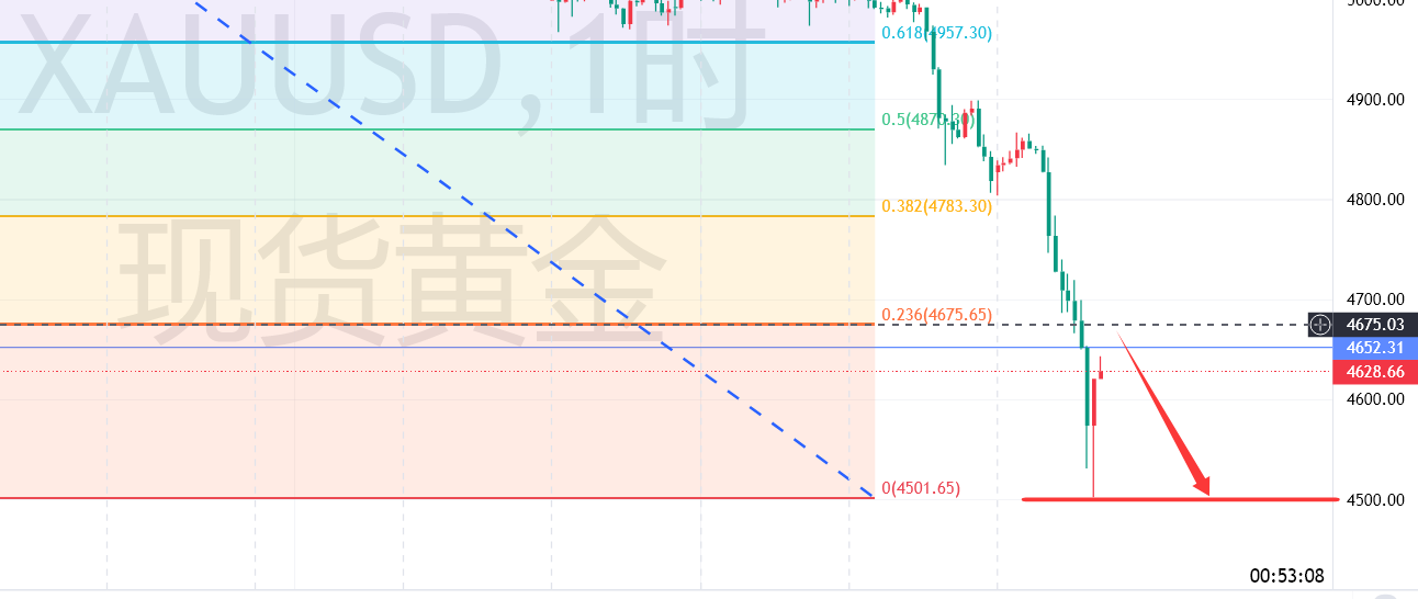 小时级别来看,金价完全贴合整体暴跌趋势,呈现“急跌-小幅震荡-再急跌”的极端走势,日内多次出现连续多根大阴线下行,无任何反弹力度。小时线均线空头排列,5日均线、10日均线同步向下压制,金价始终运行在均线下方,反弹无力。指标方面,MACD绿柱动能维持高位,死叉形态未发生任何改变,空头力量持续释放;KDJ指标在超卖区钝化,难以形成有效拐头,短期反弹仅为弱势修正,且反弹幅度有限,大概率反弹后会再度承压下行。关键点位方面,下方核心支撑聚焦4500-4480美元区间,该区间是短期重要支撑,若跌破将进一步下探4400美元附近;上方短期阻力关注4600-4650美元区间,该区间是今日暴跌过程中的短暂整理点位,反弹至该区间附近大概率会遭遇空头压制,难以有效突破;进一步上方阻力则是4700、4800美元,均为前期失效支撑转化的强阻力,小时线级别难以触及。