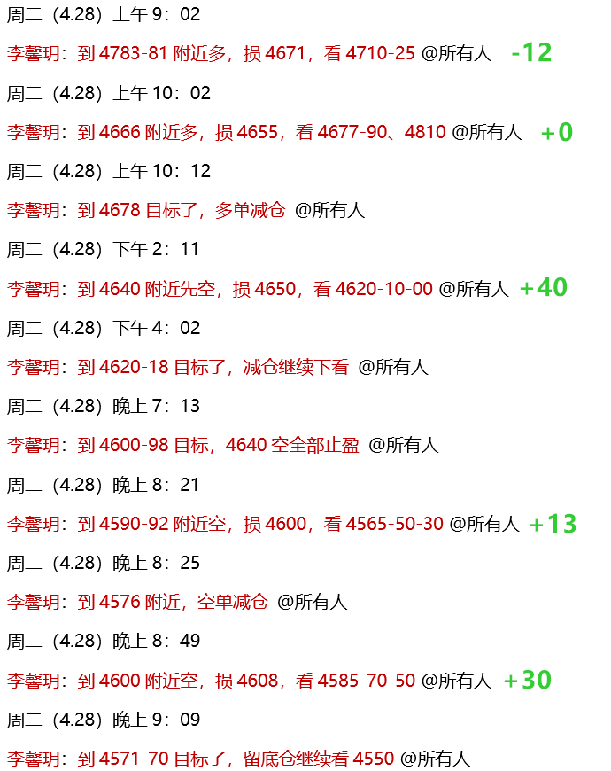 4.28 周二,早间策略提及“黄金反弹高点逐步下移,多次下探测试支撑,就会加大下破风险”果不其然,黄金走出大跌空间!实盘中,先是早间4782多单,获利未出结果扫损出局!下探后按策略4666多单,在4678-80获利减仓!午后下跌破位,反弹果断在4640做空,顺利到4598目标止盈!晚间反弹又在4590做空,到4576获利!而后在4600再次空,到4570目标再赚!今日下跌完全符合预期,操作及时转向,空单斩获三连胜,也是大获全胜!